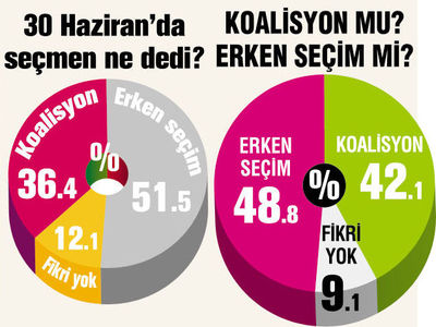 Türkiye’nin cevap aradığı en can alıcı soru “erken seçim” ve “koalisyon” la ilgili sorular oldu. ANDY-AR, “Hükümet kurma çalışmaları sonucunda koalisyon mu, erken seçim mi olur?” diye sordu. Bu soruya “Erken seçim” yanıtını verenlerin oranı yüzde 69.1 çıktı. “Koalisyon” kurulacağını düşünenlerse yüzde 14.7’de kaldı. “Fikrim yok, bilmiyorum” cevabıysa yüzde 16.2 oranında oldu. Ancak, aynı seçmene araştırma şirketi, “Sizce koalisyon mu, erken seçim mi olmalı?” sorusunu yöneltti. “Erken seçim olmalı” cevabını verenler yüzde 48.8 çıkarken, “Koalisyon kurulmalı” diyenlerin oranı yüzde 42.1’i buldu. Bu oran, ANDY-AR tarafından yine HABERTÜRK için yapılan ve 30 Haziran’da yayınlanan çalışmada yüzde 36.4 çıkmıştı. Yani son 42 günde tüm seçmen üzerinden ‘koalisyon kurulmalı’ diyenlerin oranı yüzde 6 arttı.