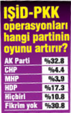 Suruç’taki canlı bomba saldırısı ve Şanlıurfa’nın Ceylanpınar İlçesi’nde 2 polis memurunun uyurken şehit edilmesinin ardından başlayan ‘terör örgütlerine yönelik operasyon sürecini’ de seçmen değerlendirdi. Araştırma şirketi ankete katılanlara, “IŞİD ve PKK operasyonları, olası bir erken seçimde hangi partinin oyunu artırır?” diye sordu. “AK Parti’nin oyu yükselir” diyenler yüzde 32.8 ile birinci sırada yer aldı. HDP’nin oyunu artıracağını belirtenlerin oranıysa yüzde 17.3 ile ikinci oldu. CHP’nin oy artışı yaşayacağını ifade edenler yüzde 4.4, “MHP’nin oyu artar” diyen seçmenin yüzdesi 3.9 çıktı.