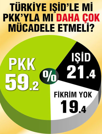ANDY-AR, 3 hafta önce terör örgütlerine yönelik sınır içi ve ötesinde başlatılan operasyonların ardından seçmene, “Türkiye, IŞİD’le mi PKK’yla mı daha çok mücadele etmeli?” sorusunu yöneltti. Ankete katılanların yüzde 59.2’si, “PKK’yla daha fazla mücadele etmeli” cevabını verdi. “IŞİD ile daha fazla mücadele edilmeli” diyenlerin oranıysa yüzde 21.4 oldu. Bir fikri olmadığını belirten ve “Bilmiyorum” diyenlerse yüzde 19.4 oranında çıktı.
