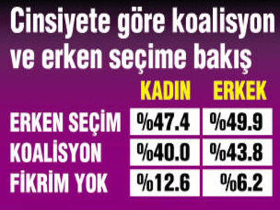 Erken seçim ve koalisyon tercihinin cinsiyete göre dağılımındaysa kadınlarda da erkeklerde de “Erken seçim” diyenlerin oranı “Koalisyon” diyenleri geride bırakıyor. Bununla birlikte her iki tercih de yüzde 40 pastası içerisinde yanıt buluyor. Erkeklerin yüzde 49.9’u “Erken seçim”, yüzde 43.8’i “Koalisyon” yanıtını veriyor. Kadınlarınsa yüzde 47.4’ü “Erken seçim olsun” cevabını verirken, yüzde 40’ı “Koalisyon kurulmalı” görüşünü belirtiyor.