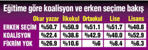 “Erken seçim” ve “koalisyon” isteğini araştırma şirketi “eğitim durumuna göre” de irdeledi. Eğitim durumuna göre “Erken seçim olmalı” diyenlerin oranı lise mezunlarında yüzde 51.7, ortaokul mezunlarında yüzde 51.1 ve ilkokul mezunlarında yüzde 50.9 çıktı.