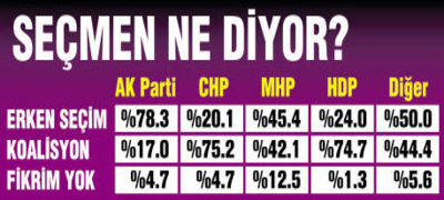 Araştırma şirketi koalisyon ve erken seçime ilişkin sorularını dört partinin seçmeninin tercihine göre de detaylandırdı. Partilere göre seçmenin “Erken seçim mi, koalisyon mu olmalı?” sorusuna yanıtları şöyle oldu. AK Partili seçmenin yüzde 78.3’ü, “Erken seçim” dedi. Bu en yüksek oranı MHP’li seçmen yüzde 45.4 ile izledi. “Erken seçim” diyen en düşük oran yüzde 20.1 ile CHP’li seçmen olurken, HDP’lilerin yüzde 24’ü de ‘Erken seçim’ cevabını verdi.