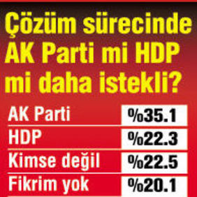 Peş peşe gelen şehit haberlerinin ardından ‘çözüm süreci’yle ilgili seçmenin ne düşündüğünü ANDY-AR araştırdı. Çözüm süreciyle ilgili ‘AK Parti’nin mi HDP’nin mi daha istekli’ olduğunu seçmene sordu. Anket katılımcılarının yüzde 35.1’i “AK Parti çözüm sürecinde daha istekli” cevabını verdi. Bu soruya yanıt veren ve ikinci büyük paydayı oluşturan kesimse yüzde 22.5 ile “Kimse istekli değil” değerlendirmesi oldu. HDP’nin çözüm sürecinde daha istekli göründüğünü dile getirenlerse yüzde 22.3 olarak sonuca yansıdı.