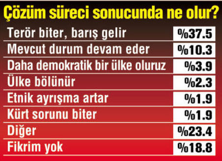 Araştırma şirketi “Çözüm sürecinin sonunda ne olur?” diye katılımcılara sordu. Ankete katılan ve pastanın en büyük dilimini oluşturan yanıt, yüzde 37.5 ile “Terör biter, barış gelir” oldu. Bu soruya verilen cevaplarda yüzde 10.3 ile “Mevcut durum devam eder” ikinci sırada, “Daha demokratik bir ülke oluruz” düşüncesiyse yüzde 3.9 ile üçüncü sırada yer aldı. Çözüm süreci sonunda “Ülke bölünür” diyenler yüzde 2.3, “Etnik ayrışma artar” fikrini ifade edenlerse yüzde 1.9 olarak ankette yer buldu.