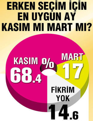 Koalisyonun kurulamaması ve olası bir erken seçim kararının ardından ‘seçim tarihi’nin ne olması gerektiğine ilişkin seçmenin tercihi ‘2015 Kasım’ı oldu. Bu yıl kasım ayında erken seçimin olabileceğini söyleyen seçmenlerin oranı yüzde 68.4 çıktı. Kışı geride bıraktıktan sonra 2016 yılının mart ayında erken seçim olabileceğini belirtenlerin yüzdesi ise 17 oldu.