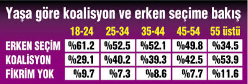 Seçmenin “Erken seçim mi olsun”, “Koalisyon mu kurulsun” cevabı da yaşa göre dağılımda değişkenlik gösterdi. Genç nüfusun eğilimi erken seçimin olması, yaşlı nüfusun tercihiyse koalisyon yönündeydi. 18-24 yaş arası seçmenin yüzde 61.2’si, 25-34 yaş arası seçmenin yüzde 52.5’i, 35-44 yaş arası seçmeninse yüzde 52.1’i “Erken seçim olsun” cevabını verdi.