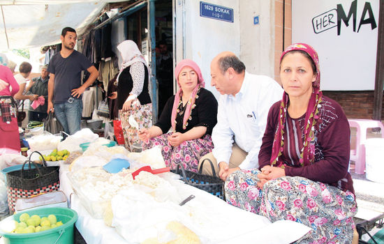 Aydın’ın ünlü Salı Pazarı’nda, Nurgül Tetik ve Bedia Ayaz (sol başta), Kızılcadağ Köyü’nde yetiştirdikleri ürünleri satıyor. Tetik ve Ayaz, hayvan yemi fiyatının yüksekliğinden yakınıyor.