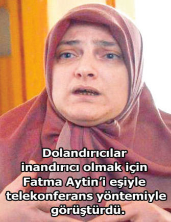 Konya’da yaşayan Aytin çifti de telekonferans yöntemiyle dolandırıldı. Fatma Nur Aytin’i ev telefonundan arayarak kendilerini polis olarak tanıtan dolandırıcılar, “Diyarbakır’da bir kuyumcu soygununda kendisinin kimlik fotokopisinin olay yerinde delil olarak bulunduğunu, olayı aydınlatmak için verecekleri hesaba para yatırması gerektiğini” söyledi. Aytin’in kendisi gibi öğretmen olan eşi Faruk Aytin’i aynı anda telefonla arayan dolandırıcılar, yine aynı yalanı söyledi ve “Eşin de yanımızda” deyip çifti telekonferans yöntemiyle görüştürdü. Aytin çiftine telefonu kapatmamalarını söyleyen dolandırıcılar, saatlerce paranın söyledikleri hesaba yatırılmasını bekledi. Bankaya giden Faruk Aytin, 28 bin liralık kredi çekti. Kredi kartından da 7 bin 500 lira çeken Aytin, 35 bin 500 lirayı dolandırıcıların söylediği hesaba yatırdı. Okula dönen Faruk Aytin, eşini aradı ancak telefon sürekli meşgul olunca bu defa polisi arayıp, “Evimdeki arama bitti mi? Eşim hâlâ yanınızda mı?” diye sordu. Dolandırıcılık, böylece ortaya çıkmış oldu. Fatma Nur Aytin, gerçek polislere zor inandı. Dolandırıcılar hâlâ aranıyor.