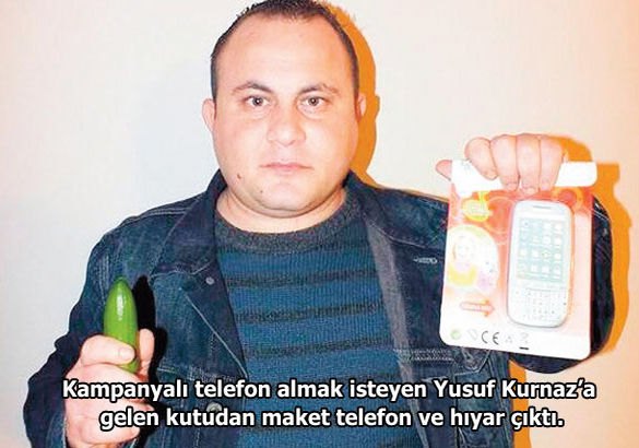 Erzurum’da yaşayan Ersavaş Ay ise internet sitesi üzerinden dolandırıldı. 3 çocuk babası Ersavaş Ay, bir internet sitesinde gördüğü 235 liralık iPhone4 cep telefonundan sipariş etti. Eve gönderilen kolinin içinden, telefonun reyon tanıtımlarında kullanılan maket telefon çıktı. “32 yıllık esnafım, böyle dolandırıcılık görmedim” diyen Ay, suç duyurusunda bulundu. Muğla Marmaris’te de Yusuf Kurnaz, iPhone marka telefon sahibi olabilmek için internette rastladığı bir siteden cep telefonu almak istedi. “Hemen satın al” butonunu tıklayan Kurnaz’ı, beş dakika geçmeden siteden bir kişi aradı ve kampanyalı telefon konusunda ikna etti. Kurnaz bunun üzerine sipariş verdi. Kargo geldiğinde kutuyu kontrol etmeden önce 900 lira ödeyen Kurnaz, kutuda oyuncak bir telefon ve küçük bir salatalıkla karşılaştı. Kurnaz, kargo yetkilisinin de parasını geri vermemesi üzerine site ve kargo yetkilileri hakkında suç duyurusunda bulundu. Parasının gitmesinden çok kutunun içinden salatalık çıkmasına kızdığını söyleyen Kurnaz, siteyi aradığında ise “Biz domates gönderdik” gibi aşağılayıcı cevaplar verildiğini aktardı. Polis dolandırıcıları arıyor.