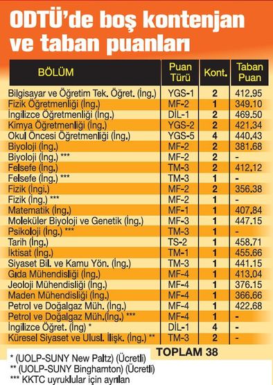 Örneğin İTÜ’de 77, Boğaziçi Üniversitesi’nde 41, ODTÜ’de ise 38 kontenjan boş kaldı. İTÜ’deki boş kontenjanların özellikle ABD üniversiteleriyle yapılan anlaşma sonucunda çift diploma programı uygulanan ücretli programlarda olduğu görülüyor. 77 boş kontenjanın 51’ini bu ücretli programlar oluşturuyor. Bu üniversitenin KKTC’de kurduğu ve yine ücretli olan denizcilik programlarında da boş kontenjan sayısı 91. İTÜ gibi ODTÜ’de de 38 boş kontenjanın 6’sı ücretli programlar.