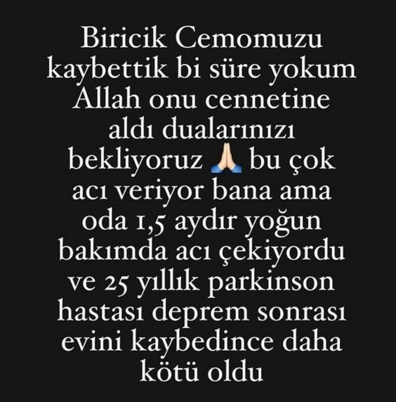 Acı haberi Yeliz Yeşilmen duyurdu. Babasının kaybıyla sarsılan Yeşilmen, üzüntüsünü ifade etti. Konuyla alakalı açıklamada bulunan Yeliz Yeşilmen, "Biricik 'Cemo'muzu kaybettik. Bir süre yokum. Allah onu cennetine aldı, dualarınızı bekliyoruz. Bu çok acı veriyor bana ama o da 1,5 aydır yoğun bakımda acı çekiyordu. 25 yıllık parkinson hastası, deprem sonrası evini kaybedince daha kötü oldu" şeklinde konuştu.
