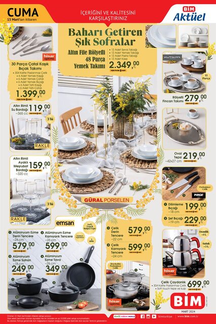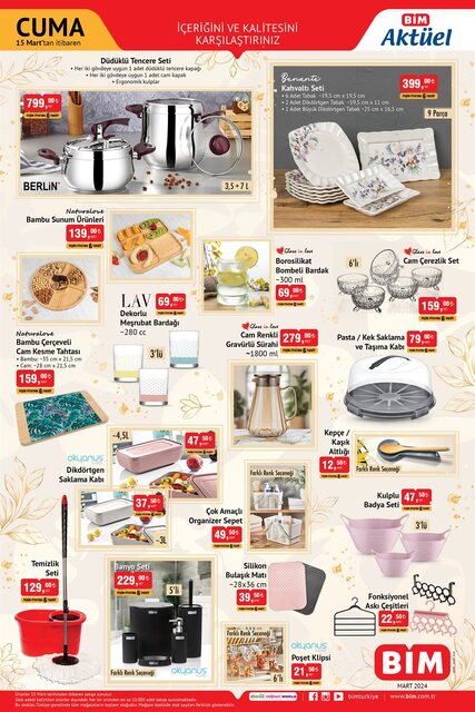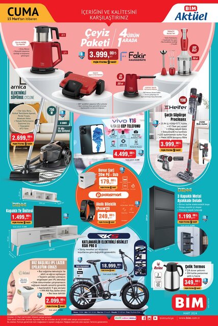 BİM aktüel kataloğu ile fiyat listesi alışveriş takipçilerinin gündeminde yer alıyor. Haftanın BİM aktüel ürünler kataloğu yayınlandı. BİM'de bu hafta; çeyiz paketinden, küçük ev aletlerine, beyaz eşyalardan, teknolojik ürünlere, kozmetik malzemelerden, mutfak eşyalarına birçok kategoride ürün indirimli fiyatlarıyla alıcılarını bekliyor. BİM aktüel 15 Mart kataloğunu haberimizde paylaştık. İşte BİM aktüel 15 Mart kataloğu ile fiyat listesi...