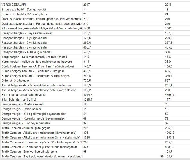 Bakanlar Kurulunun var olan yetkisini kullanmaması halinde 2018 başından itibaren çeşitli vergi, harç ve cezalar şöyle olacak:
