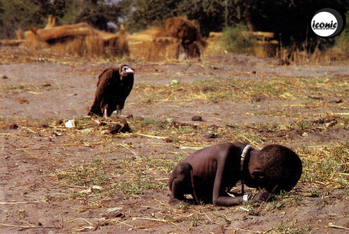 1994 yılında fotoğrafçı Kevin Cartner'ın Sudan'da çektiği fotoğrafta Birleşmiş Milletler kampına gitmek isteyen küçük bir kız çocuğunun ölümünü bekleyen akbaba görülüyor.