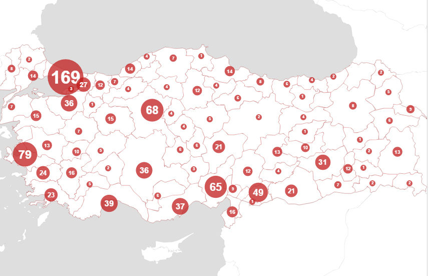 Haritaya göre; 5 yıllık sürede en çok kadın cinayeti sırasıyla İstanbul, İzmir, Ankara, Adana ve Gaziantep'te işlendi.
