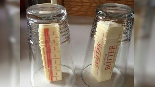 Donmuş tereyağını kısa sürede yumuşatmak için bir bardağı ısıtın, tereyağını bir tabağa koyup üzerine su bardağı kapatın.