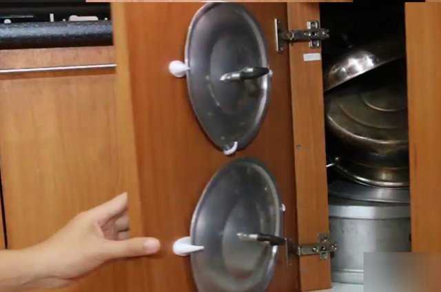 Tencere kapaklarına yer bulmak her zaman sıkıntıdır. Dolap kapağına tutacak yapıştırarak alternatif saklama alanı oluşturabilirsiniz.