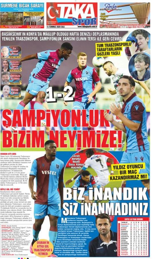 Ligin 32. haftasında dün akşam lider Medipol Başakşehir deplasmanda İttifak Holding Konyaspor'a 4-3 kaybederken, takipteki Trabzonspor, 4 puanlık farkı eritme fırsatı yakaladı. Ancak, 62 puanla ikinci sıradaki bordo-mavililer de dış sahada Yukatal Denizlispor'a 2-1 mağlup oldu. Hüseyin Çimşir'in öğrencileri bu skorla son 2 haftasına girilen ligde şampiyonluk şansını mucizelere bıraktı. Son viraja girilirken art arda puanlar kaybederek taraftarlarını hayal kırıklığına uğratan Trabzonspor'un durumu yerel gazetelerde yankı buldu. Gazeteler, 41 yaşındaki teknik adam Çimşir ve futbolculara tepki gösterdi.