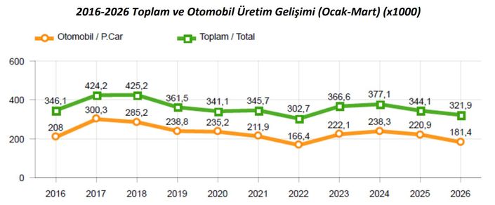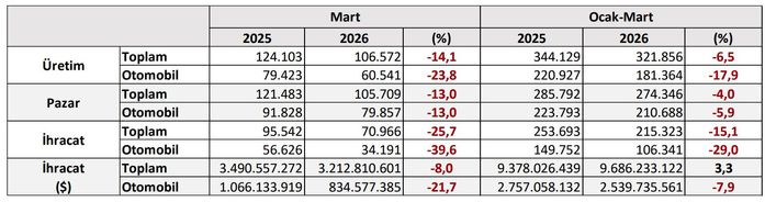 Buna göre, ocak-mart döneminde toplam otomotiv üretimi bir önceki yılın aynı dönemine göre yüzde 7 düşüşle 321 bin 856 adede geriledi. Otomobil üretimi ise ise yüzde 18 düşüş yaşadı ve 181 bin 364 adet olarak gerçekleşti. Traktör üretimiyle birlikte toplam üretim ise 327 bin 16 adet adedi buldu.