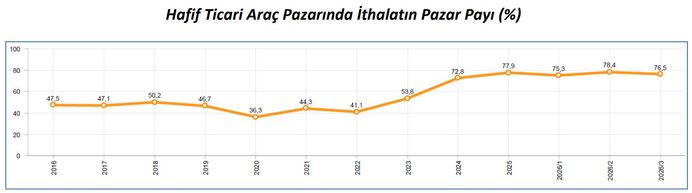 Ocak-Mart ayında hafif ticari araç (minibüs+kamyonet) pazarında ithalatın payı yüzde ise 77 olarak gerçekleşti. Yılın ilk 3 ayında toplam hafif ticari araç satışları yüzde 4, ithal hafif ticari araç satışları yüzde 2 ve yerli hafif ticari araç yüzde 12 oranlarında arttı.