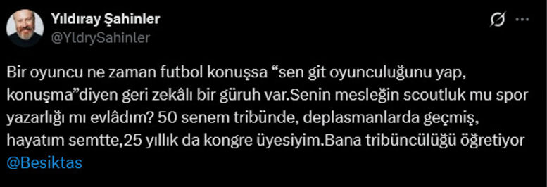 Yıldıray Şahinler; "Bir oyuncu ne zaman futbol konuşsa 'sen git oyunculuğunu yap, konuşma' diyen geri zekâlı bir güruh var. Senin mesleğin scout'luk mu spor yazarlığı mı evlâdım? 50 senem tribünde, deplasmanlarda geçmiş, hayatım semtte, 25 yıllık da kongre üyesiyim. Bana tribüncülüğü öğretiyor" ifadelerini kullandı.