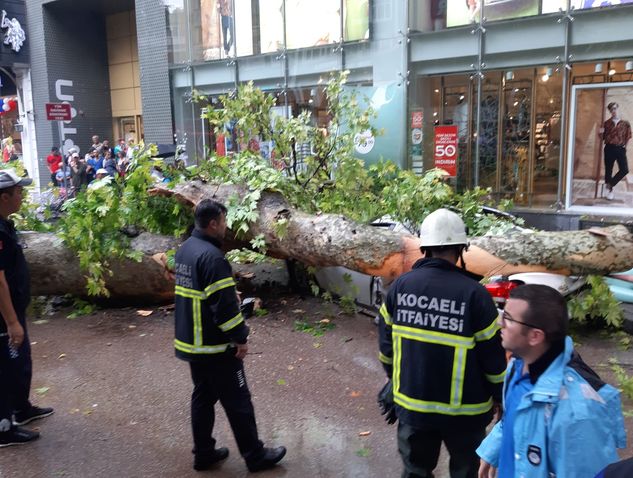 Kocaeli’nin İzmit ilçesinde şiddetli fırtına ve yağmur nedeniyle bir ağaç devrildi. Yıldırım düşen ağaç otomobilin üzerine devrilirken, otomobilin sürücü Hasret Özübey son anda kurtuldu.