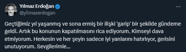 Yaşananların ardından Yılmaz Erdoğan sessizliği bozdu. Erdoğan; "Geçtiğimiz yıl yaşanmış ve sona ermiş bir ilişki 'garip' bir şekilde gündeme geldi. Artık bu konunun kapatılmasını rica ediyorum. Kimseyi dava etmiyorum. Herkesin ve her şeyin sadece iyi yanlarını hatırlıyor, gerisini unutuyorum. Sevgilerimle..." dedi.