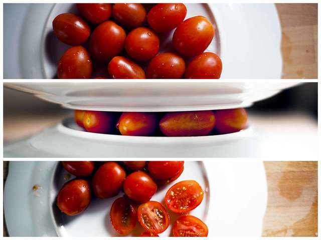 Cherry domateslerinizi tek tek kesmeye uğraşmayın. Önce iki tabağın altına domateslerinizi sıkıştırın, sonra da ortalarından kesin.