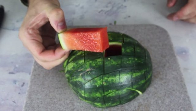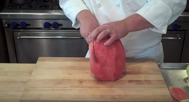 Karpuzun bir diğer kesim yöntemi de oldukça kolay. Önce kenarlarını kesin ve kalan kabuklarını bitinceye kadar kesin.