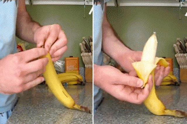 Genelde muzu forotğrafta gördüğümüzün tam tersi şeklinde açmaya çalışırız. Ama işin doğrusu, muzu arka tarafından aşağı doğru soymak.