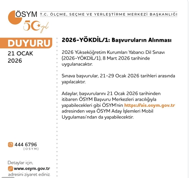ÖSYM'nin 2026 yılı sınav takvimine göre YÖKDİL/1 başvuruları 21 Ocak 2026 Çarşamba günü (bugün) başladı. Adaylar, başvurularını 29 Ocak 2026 tarihine kadar ÖSYM'nin AİS sistemi üzerinden gerçekleştirebilecek.