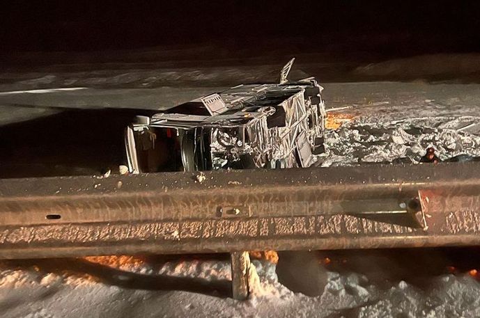 Gültekin Yolcu'nun (62) kontrolünü yitirdiği yolcu otobüsü, bariyere çarpıp yoldan çıktıktan sonra takla atarak karlı arazide yan yattı.