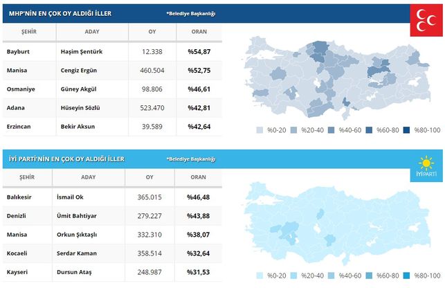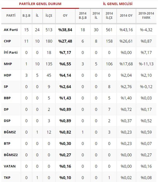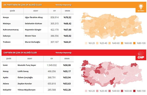 Yerel seçim sonuçları açıklanıyor. 31 Mart yerel seçimde 57 milyon 93 bin 410 seçmenin 43 milyon 651 bin 815'i oy kullandı. Seçime katılma oranı yüzde 83,99 olarak hesaplandı. Toplam oyların 1 milyon 395 bin 233'ü geçersiz sayıldı. Geçersiz oyların oranı yüzde 3,2 oldu. Peki hangi ilde hangi parti kazandı? İl il seçim sonuçları sayfamızda. İşte detaylı seçim sonuç analizi...