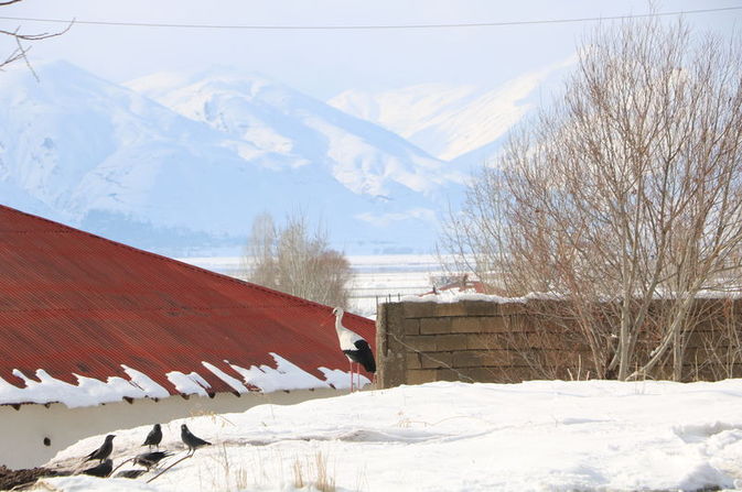 Bu kış da 4 leylek Köprücük köyüne yaklaşık 6 kilometre mesafedeki Akalan köyüne yuva kurdu. Köylüler, bir evin bacasına yuva yapan leyleklere yiyecek verip alışmaya çalışıyor.