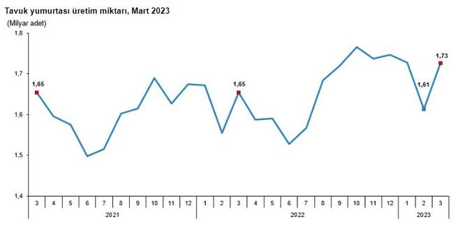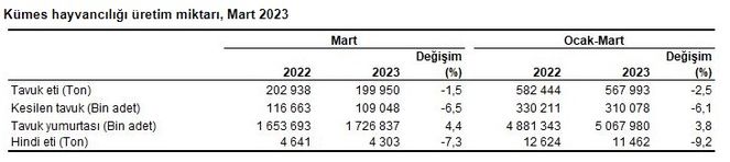 Mart ayında bir önceki yılın aynı ayına göre tavuk yumurtası üretimi yüzde 4,4 artarken; tavuk eti üretimi yüzde 1,5, kesilen tavuk sayısı yüzde 6,5 ve hindi eti üretimi yüzde 7,3 azaldı.