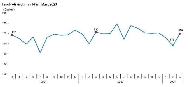 Ocak-Mart döneminde bir önceki yılın aynı dönemine göre tavuk yumurtası üretimi yüzde 3,8 artarken; tavuk eti üretimi yüzde 2,5, kesilen tavuk sayısı yüzde 6,1 ve hindi eti üretimi yüzde 9,2 azaldı. Bir önceki ay 176 bin 236 ton olan tavuk eti üretimi Mart ayında yüzde 13,5 artarak 199 bin 950 ton oldu.