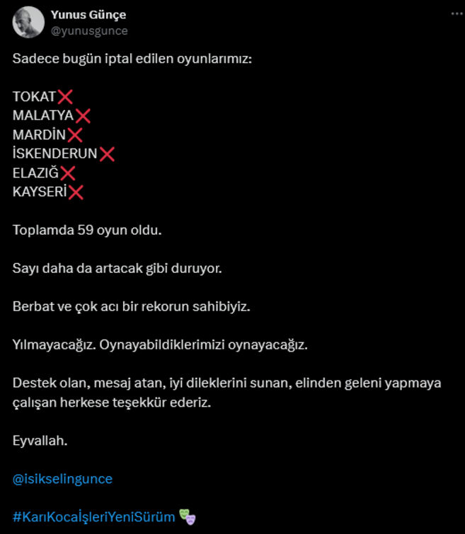 Ünlü oyuncu Yunus Günçe, 'Karı Koca İşleri - Yeni Sürüm' adlı tiyatro oyununun farklı il ve ilçelerdeki 59 gösterisinin iptal edildiğini duyurdu