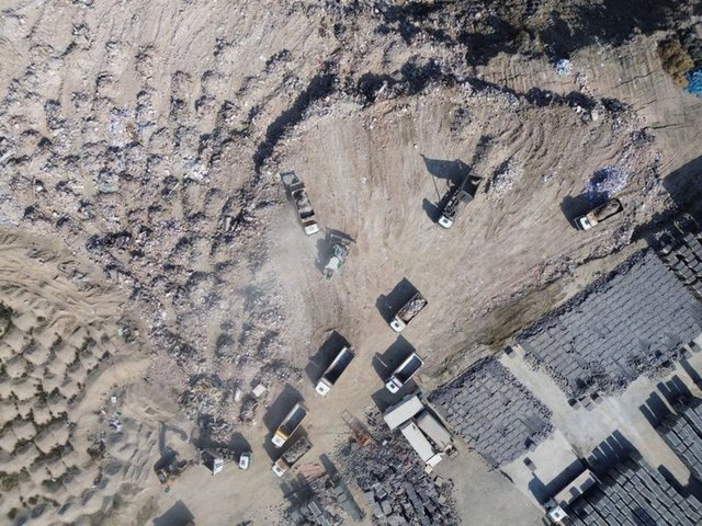 Yüzlerce kamyon yüklendikleri binlerce ton molozu dökeceği alana götürürken uzun konvoylar oluşturuyor.