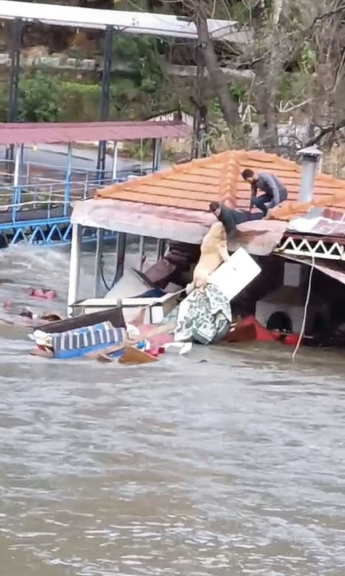 Antalya'da debisi yükselen çaydaki taşkında mahsur kalan 'Paşa' isimli köpeği çardak çatısına çekerek kurtaran iki kişinin çabası, yürekleri ısıttı