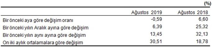 Türkiye İstatistik Kurumu Ağustos ayı (Yİ-ÜFE) verilerini açıkladı. Yurt içi üretici fiyat endeksi (Yİ-ÜFE), 2019 yılı Ağustos ayında bir önceki aya göre yüzde 0,59 düşüş, bir önceki yılın Aralık ayına göre yüzde 6,39, bir önceki yılın aynı ayına göre yüzde 13,45 ve on iki aylık ortalamalara göre yüzde 30,51 artış gösterdi