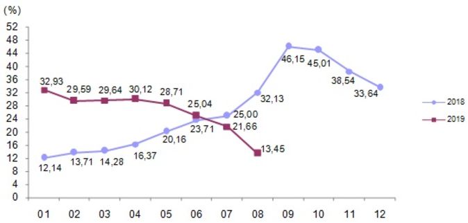 Yurt içi üretici fiyat endeksi bir önceki yılın aynı ayına göre değişim oranı, Ağustos 2019