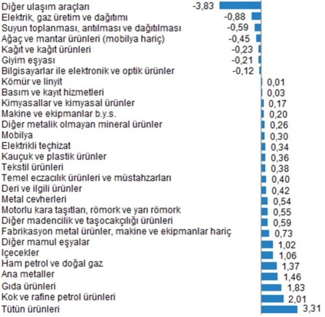Aylık en fazla azalış; %3,83 ile diğer ulaşım araçları, %0,88 ile elektrik, gaz üretim ve dağıtımı, %0,59 ile suyun toplanması, arıtılması ve dağıtılması olarak gerçekleşti. Buna karşılık tütün ürünleri %3,31, kok ve rafine petrol ürünleri %2,01, gıda ürünleri %1,83 ile endekslerin en fazla arttığı alt sektörler oldu.