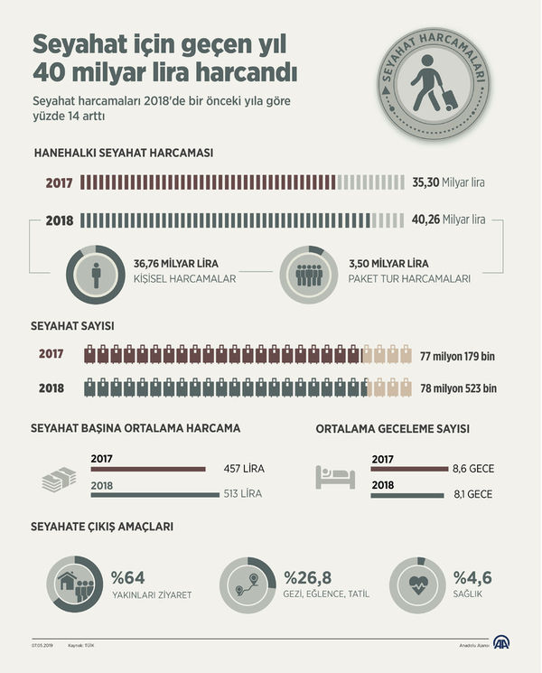 Bu yılda, yurt içindeki seyahatlerde yapılan toplam seyahat harcamaları geçen yıla göre %14 artarak 40 milyar 266 milyon 153 bin TL oldu.