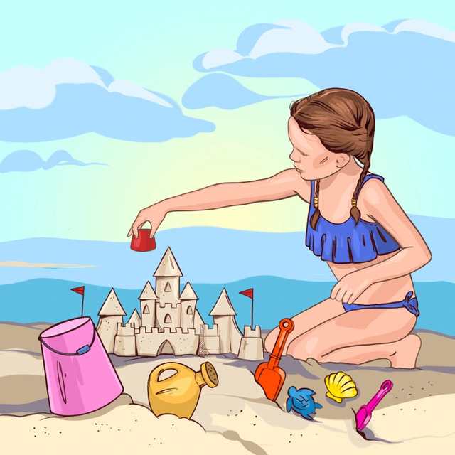 Cevap: Çocuğun yaptığı kumdan kalenin üzerinde olması gereken bayrak flaması, kovanın üzerinde duruyor.