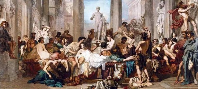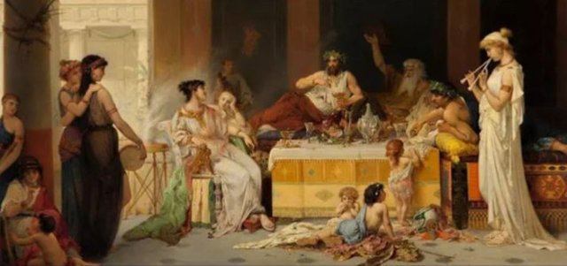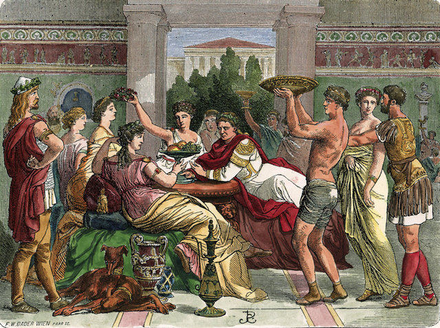 MÖ 7. yüzyılda bu eğilimi başlatan Yunan atalarından alınmıştır. Bu genellikle, daha yüksek sosyal sınıfa sahip olanlara saatlerce çeşitli yiyecek ve içeceklerin sunulduğu ve onların kalkmak için tek nedenlerinin biraz daha yer açmak için tuvalete gitmek olduğu bir ziyafet veya ziyafet gerçekleştiğinde yapılırdı.