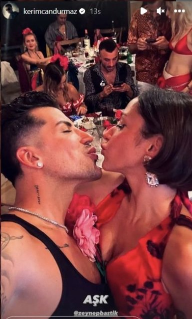 Zeynep Bastık'ın roman konseptli doğum günü partisine katılan fenomen Kerimcan Durmaz, ünlü şarkıcıyla dudak dudağa verdiği pozu sosyal medya hesabından "Aşk" notuyla yayınladı.