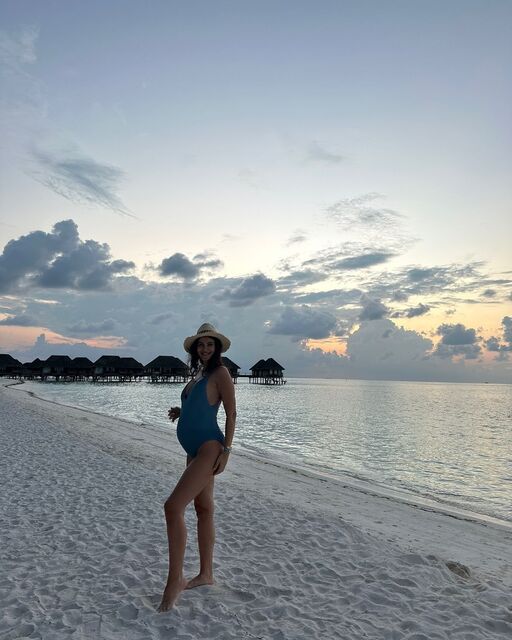 Paylaşımlarına devam eden Demirel, bu kez büyüyen karnıyla tatilden verdiği pozları paylaştı.