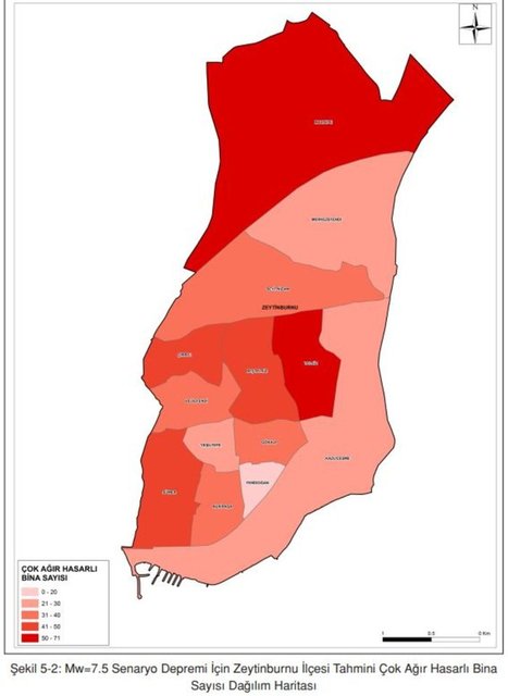 * Senaryo depremi için Zeytinburnu ilçesi tahmini çok ağır hasarlı bina sayısı dağılım haritası