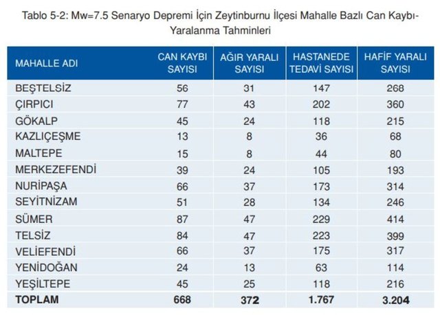 * Senaryo depremi için Zeytinburnu ilçesi mahalle bazlı can kaybı ve yaralanma tahminler