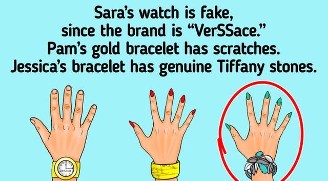Cevap: Sara içindeki VerSSace yazan bir saat takıyor dolayısıyla bu saat orijinal markanın sahtesi olduğundan zengin olan kişi olamaz. Pam'in bileziği ise çiziklerle dolu yani çok uzun zamandır takıyor. Jessica'nın bilekliğinde ise pahalı bir taş olan Tiffany taşı var o yüzden en zengin olanları sağdaki Jessica'dır.